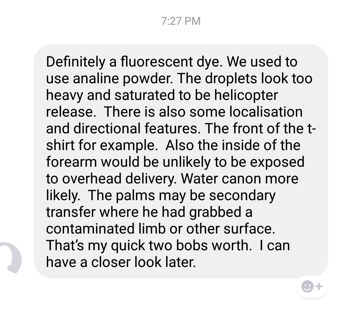 https://forensic-architecture.org/investigation/herbicidal-warfare-in-gaza … This report/video might be interesting for everyone too, very different circumstances but a similar possible delivery system so maybe some insight from that. Also there are products for UV-marking in significant quantities (https://gmktp.co.uk/product/total-ir …)...