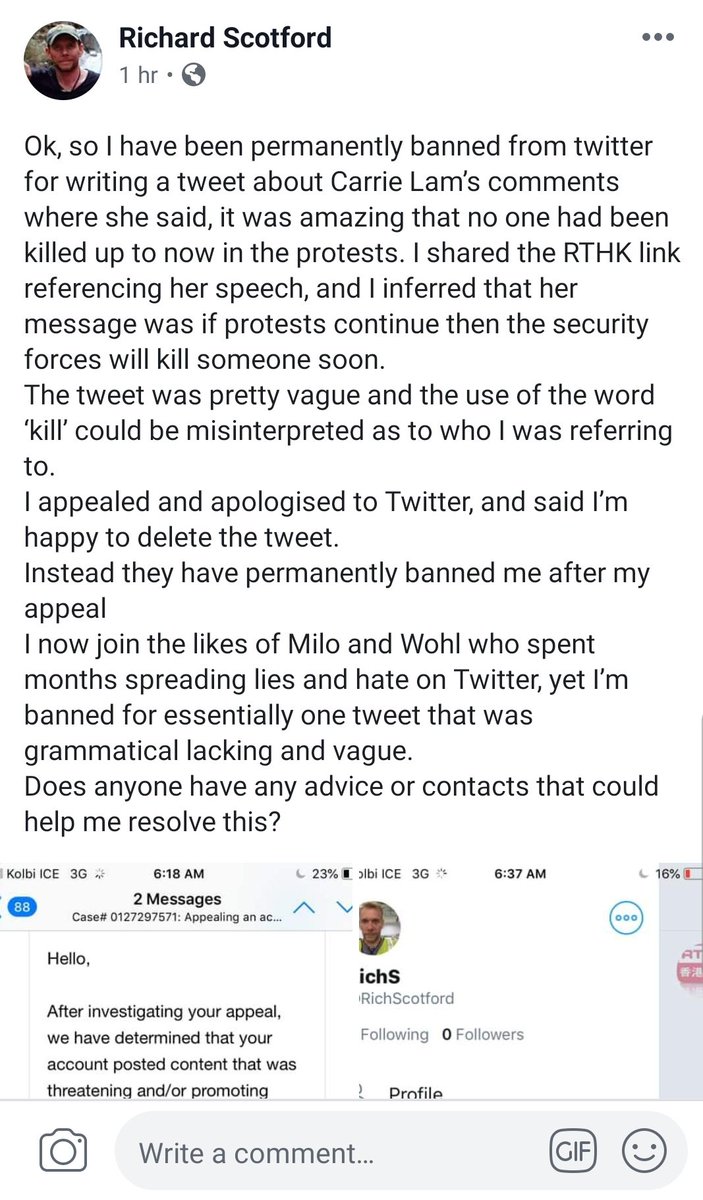 Frontline #HongKongProtests reporter Richard Scotford has been "permanently banned from Twitter for writing a tweet about #CarrieLam's comments", in which he "inferred that her message was if protests continue then the security forces will kill someone soon". pic.twitter.com/vNz9J6h3wH