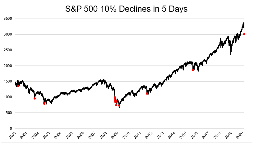 S&P 500 down 10.7% over the last five days, which doesn't happen too often. Over last 20 years: -Yuan Deval (2015) -Eurozone crisis (2011) -GFC ('08/'09) -Dotcom bubble ('00,'01,'02) pic.twitter.com/SAB22BvGCf