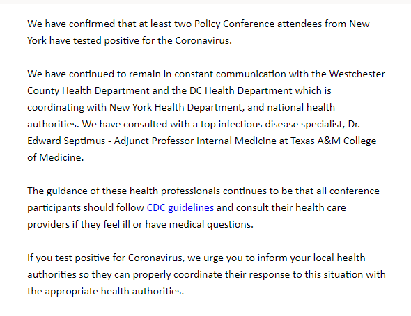 Important Update: Coronavirus As emailed to Policy Conference attendees, participants, speakers, administration and Hill offices. https://www.cdc.gov/coronavirus/2019-ncov/index.html … pic.twitter.com/EHl694pkgJ