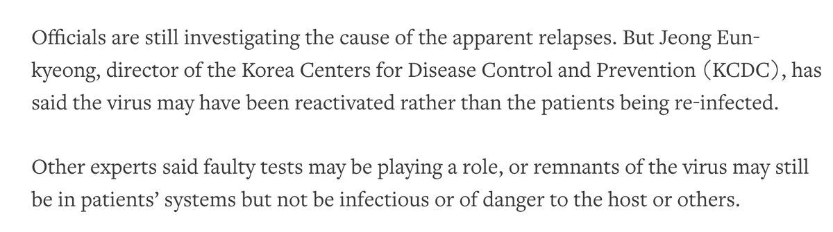 What's wrong with this article? It distinguishes between reactivation and reinfection. It doesn't say that reactivation, a term used by Korea's CDC, is definitely occurring. It notes that this is just one possibility under investigation.pic.twitter.com/NLdR3e1L3r