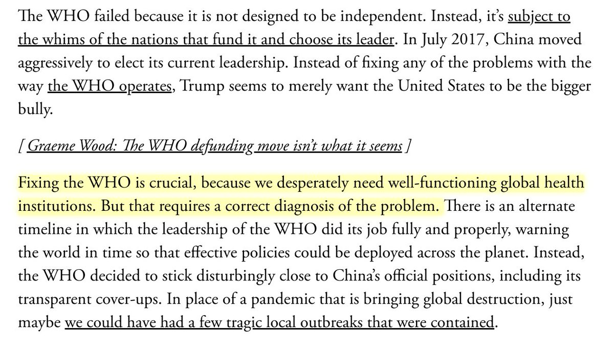 New from me: We must recognize that the WHO failed but also that President Trump wants to break it even further. I get the impulse to defend the WHO wholesale but that doesn't help us fix this. If the WHO had stepped up, we might have avoided a pandemic. https://www.theatlantic.com/health/archive/2020/04/why-world-health-organization-failed/610063/ …pic.twitter.com/HjL2bgwmLI
