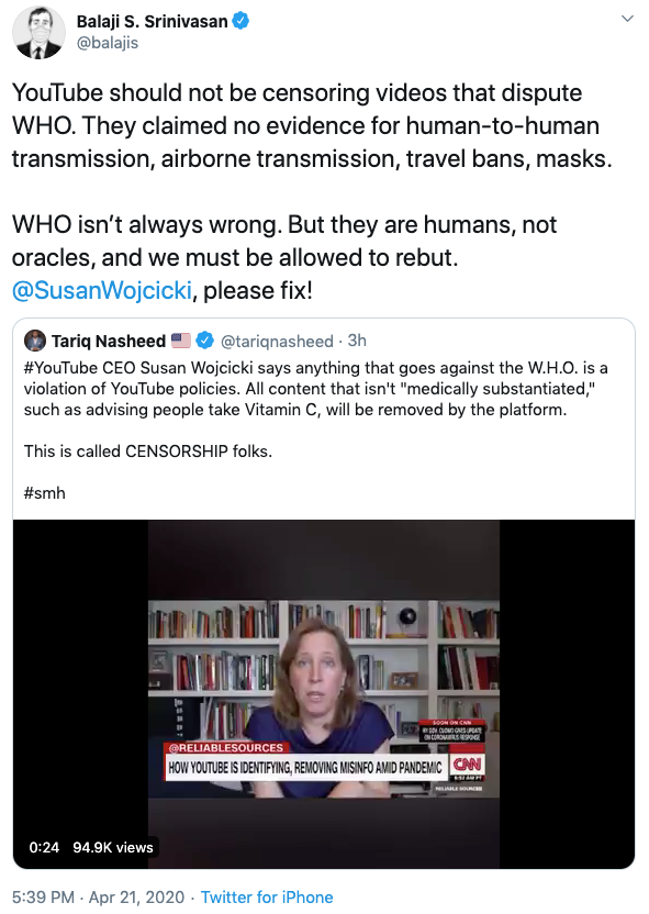 Here's a small example of this (and I'm a Balaji fan, this is not anti-Balaji content!) - someone from the "things weren't taken seriously seriously enough" faction quoting a loopy anti-vax truther, in service of hitting at their common enemy, the WHOpic.twitter.com/eYDVQ6miMo
