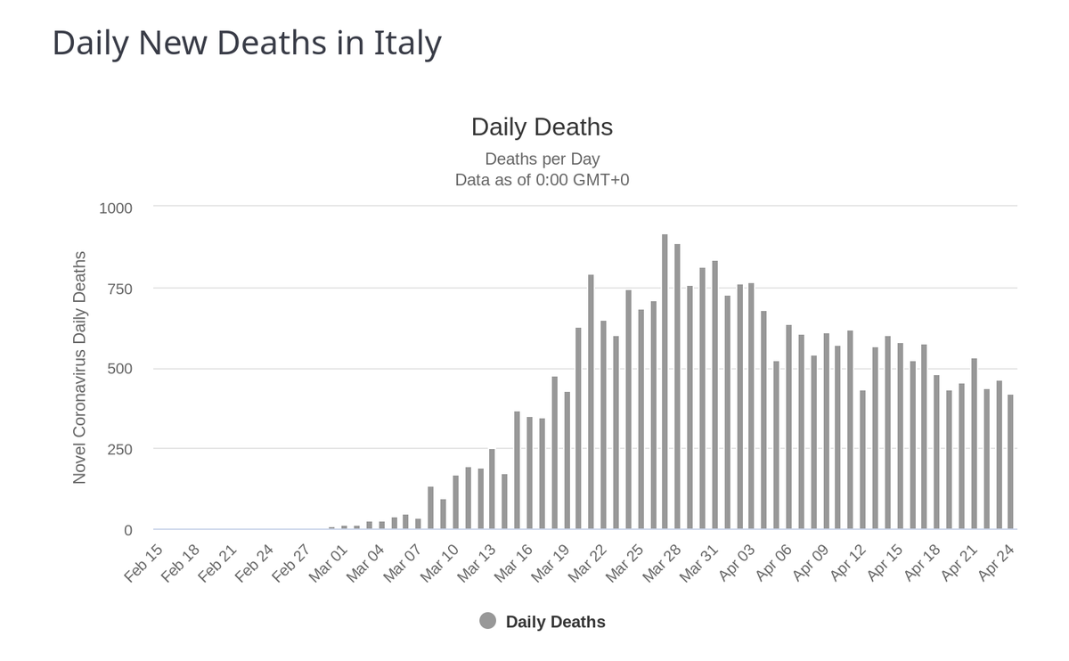 I know that many people are looking at slope charts and discussing peaks, but do keep in mind: a decreasing or steady rate of deaths is a much better news than the alternative but a steadyish but a high rate of death can still be devastating. Italy still has 400+ deaths per day.pic.twitter.com/BB1IaJZrKF