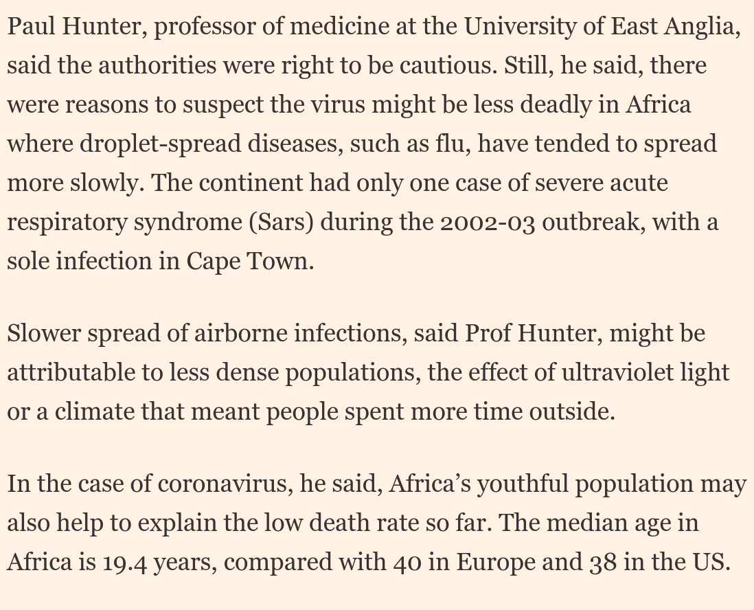 Also remember that heat and humidity kill the virus faster, and much of Africa is hot, humid, or both.