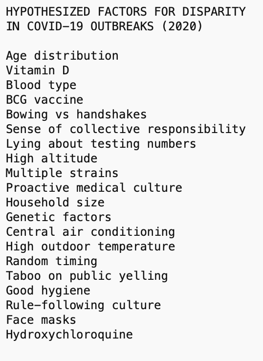 This morning @zeynep asked why Japan and India did not look like Lombardy or NYC. I made a list of the explanations people offered, juxtaposed against a list of reasons experts gave in 1910 to explain the prevalence of scurvy on prolonged polar voyages https://twitter.com/zeynep/status/1258548813888811008 …pic.twitter.com/o4dyBQLvQO