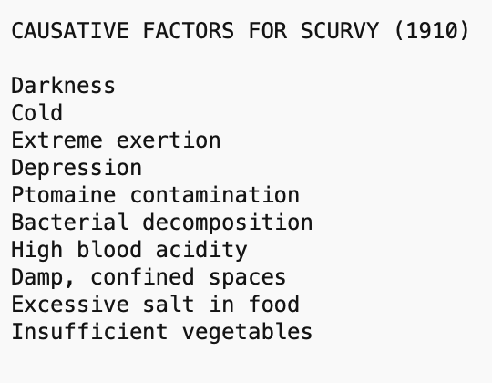 Scurvy is a nice story because the answer was simple, once you had it. Not all illnesses have that nice story. Especially nowadays: we have sorted out the simple problems, only the complex ones remain.