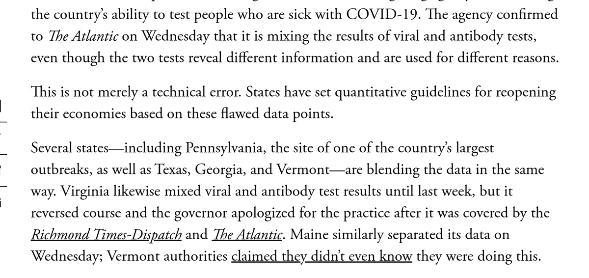 Pennsylvania, Georgia, Texas, and other states [Vermont, Virginia until recently] are doing the same. "The intermingling of viral and antibody tests suggests that some of those gains might be illusory."