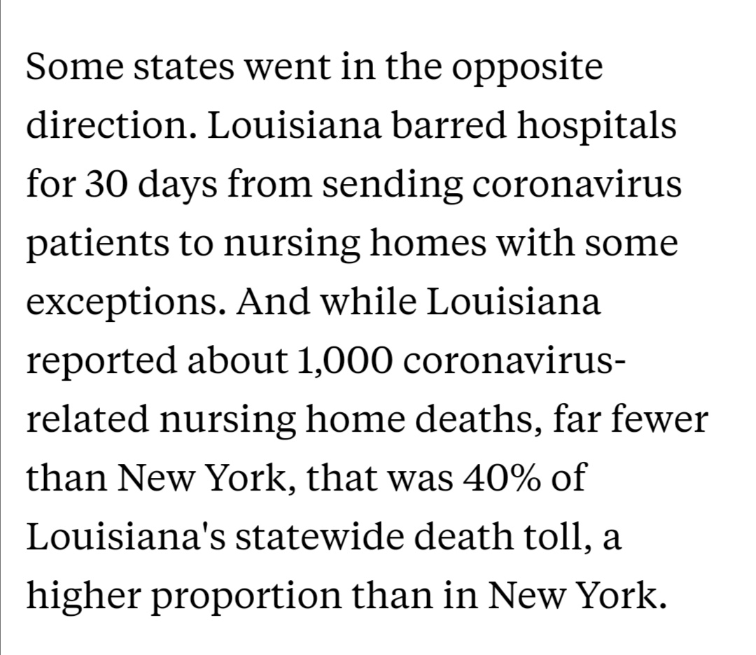 I wish this article didn’t skip over the question of “does recovering mean still infectious?” It has a little throwaway mention that LA didn’t do this and still had huge proportions of nursing home deaths, but doesn’t seem to dig in any on that.