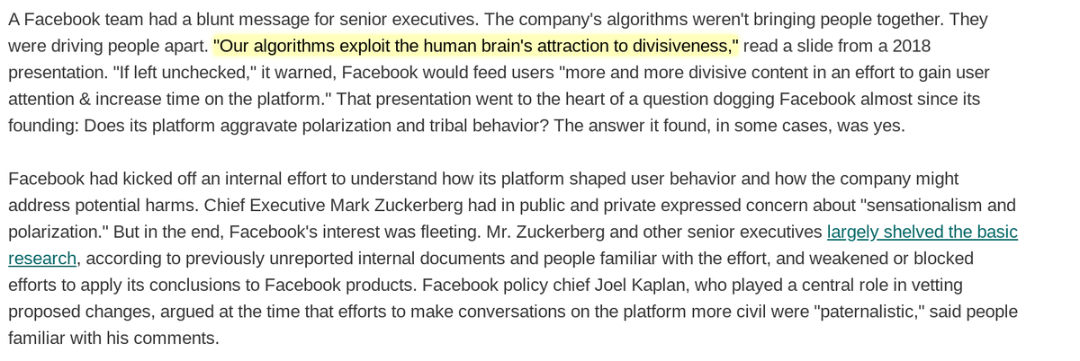 Facebook's own researchers found that “64% of all extremist group joins are due to our recommendation tools" and that “our recommendation systems grow the problem.” Facebook VP for policy Joel Kaplan (known for throwing a party for Kavanaugh after confirmation) nixed any action.https://twitter.com/dseetharaman/status/1265312209602674688 …