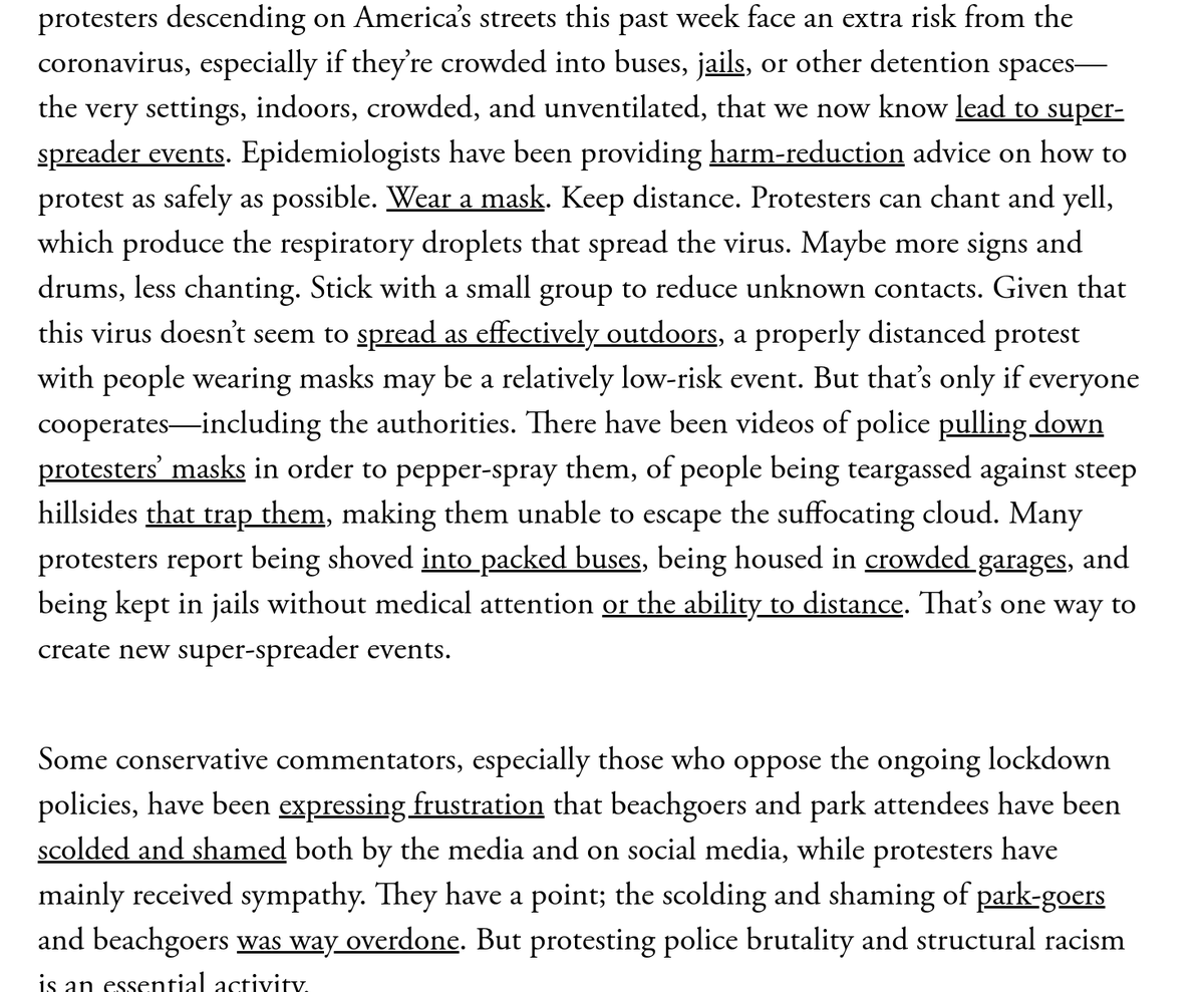 I know! I linked to it, and added mine to my piece on protesting during a pandemic. I loved the other pieces, too. But I think it's fair to say that there wasn't as loud an attempt to provide harm-reduction guidance on broader range of activities. https://www.theatlantic.com/health/archive/2020/06/i-cant-breathe-using-tear-gas-during-pandemic/612673/ …pic.twitter.com/FoxCBXFR0S