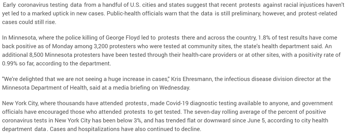 Of protests and pandemics: It's plausible that there won't be a noticeable spike. Outdoors, masked, moving are all in favor. That said, there might be an increase a/pre/pauci-symptomatic cases that will transmit onward. A sane country would track! https://www.wsj.com/articles/recent-protests-may-not-be-covid-19-transmission-hotspots-11592498020 …pic.twitter.com/bC1ZCXo5S1