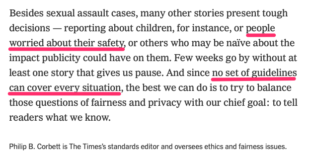 In re NYT vs @slatestarcodex, this seems relevant: According to the NYT itself, there is no one-size-fits-all policy. Which makes it even more difficult to understand why the NYT would promise/threaten to doxx Scott. https://www.nytimes.com/2017/04/15/insider/sexual-assault-naming-victims-standards.html …pic.twitter.com/bqSRiIdmih