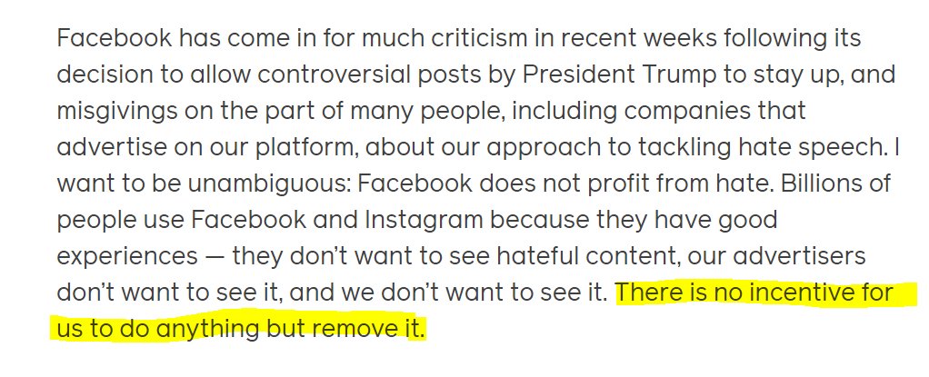 - There's no incentive for us to do anything but remove it. - Unless it comes from certain people. - Advertisers are backing away because they don't get it. - People don't want to see hateful content (just ignore the huge engagement that content gets). - We decide what's hateful.