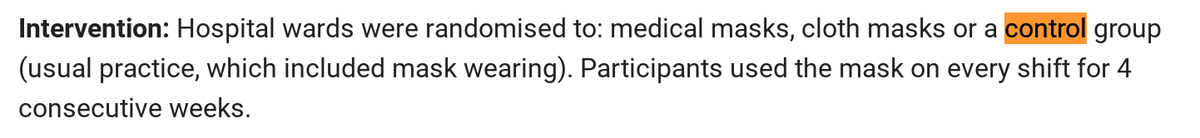 No, no! Control is "regular practice" which is surgical masks. How on earth could they do a study with no masks in a hospital? Control is not no masks. Again, lead author has been recommending cloth masks the whole time. I'll find that for you, too.pic.twitter.com/Mg4lyP4CSr