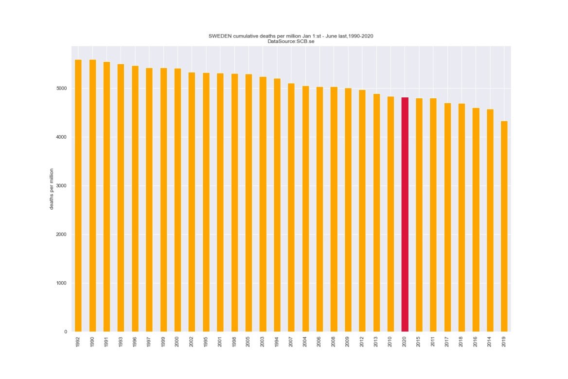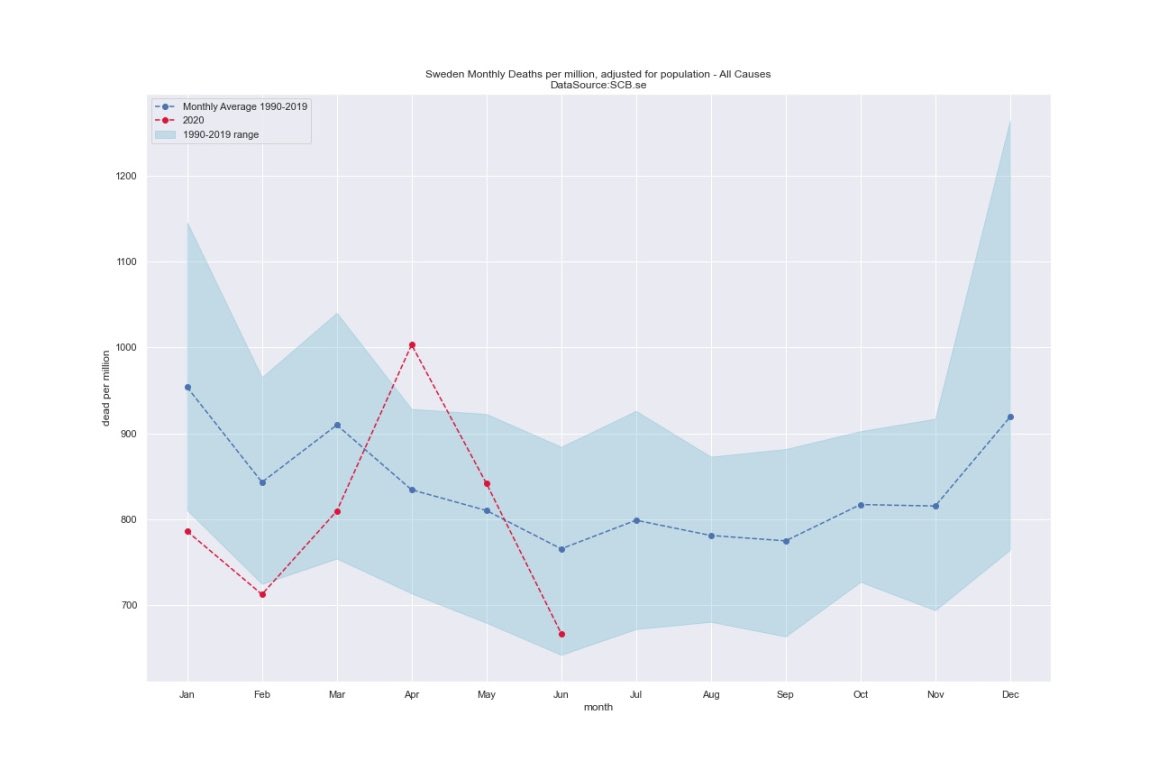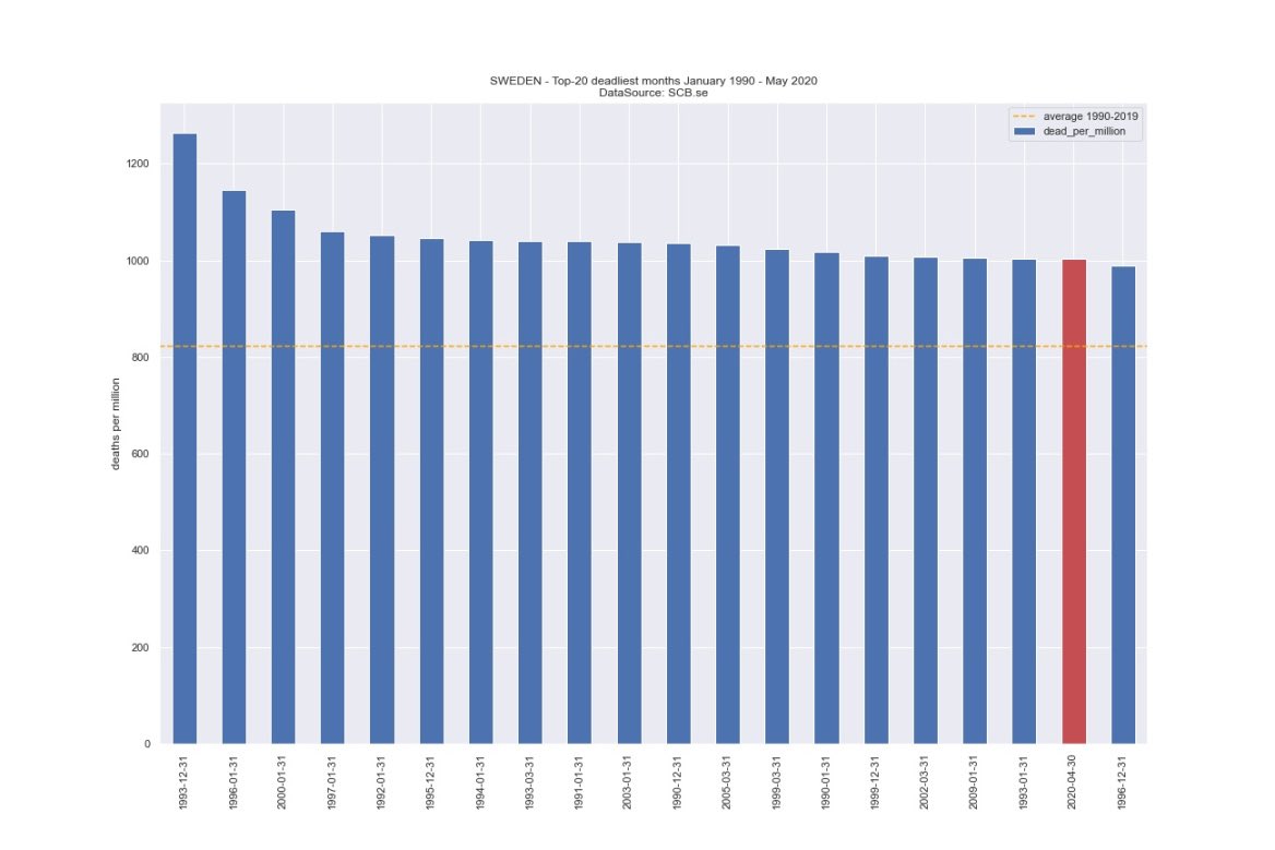 Hello Zeynep! Did you check the data from Sweden? A comparison between 1990-2019 and 2020 death rates. Only in April, there is a spike, which still is 19th in the list of deadliest months during that time. Also 6 month average is 24th in 30 years.pic.twitter.com/mmD7jZ7ifY