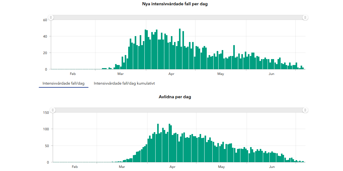 lesson should be extrapolated from a tiny country to large countries (or the world) seems a stretch, at best. 2/2 Attached are the intensive care and death graphs for Sweden. I'm not sure we have a full understanding of why they have not seen a resurgence as mobility increases.pic.twitter.com/008cNEMSYd