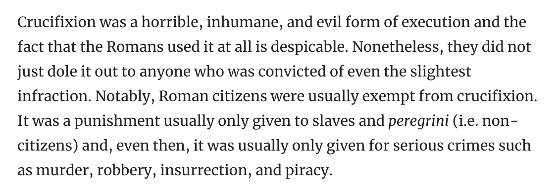 Yeah, and did you read the whole text? Pinker claims in his book that crucifixion was "widely used" and that the sentence was meted out for "petty crimes". It wasn't, and the blogger is specifically rebutting such claims.