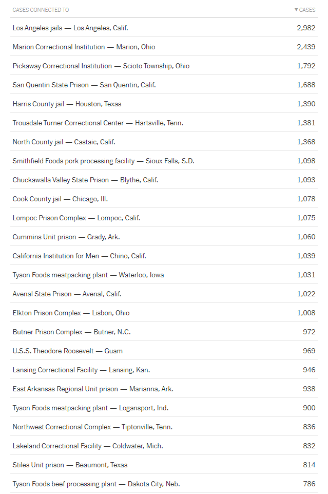 Let this sink in. So much of the surge in US #COVID19 cases stems from 4 sources: Prisons, meatpacking biz, bars, churches, and large gatherings. Today the @nytimes posted on line the entire list of COVID clusters. https://www.nytimes.com/interactive/2020/us/coronavirus-us-cases.html?action=click&module=Top%20Stories&pgtype=Homepage … pic.twitter.com/Dyo44XscN5