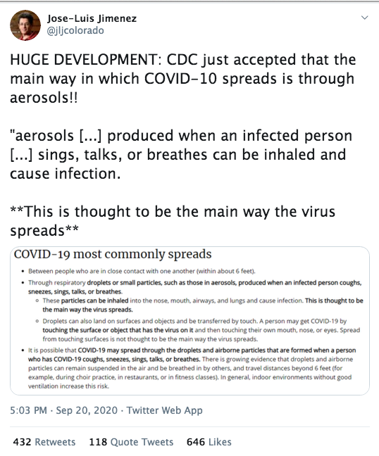 Timestamp, 20th Sep: Bittersweet win for science. So much panic w all the "don't go outside" restrictions while less attention on indoor 3C's where most infections happen. Just yesterday saw middle-aged ppl crammed INSIDE a restaurant. Read @zeynep on saga https://www.theatlantic.com/health/archive/2020/07/why-arent-we-talking-more-about-airborne-transmission/614737/ …pic.twitter.com/7qtZoBy8Y7