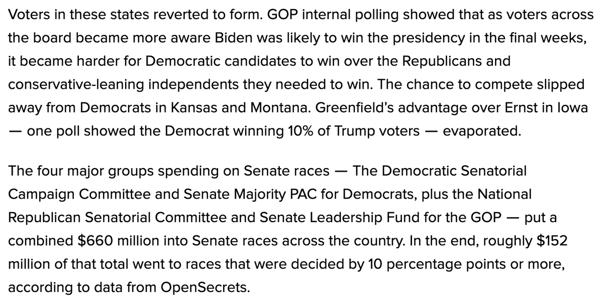 A key point: Over the final month, GOP internal polling showed voters in red states started to believe Biden was likely to win the presidency. As they did, their willingness to vote for Democratic Senate candidates down-ballot plummeted. https://www.huffpost.com/entry/how-democrats-senate-dreams-crumbled_n_5fa8914fc5b623bfac5164a9?d6f … pic.twitter.com/TR1Pq90S2M