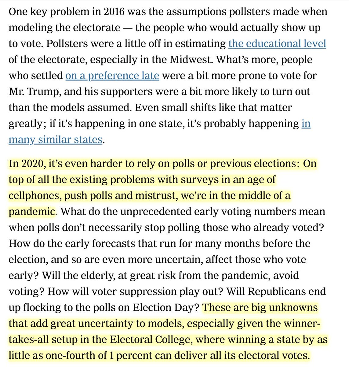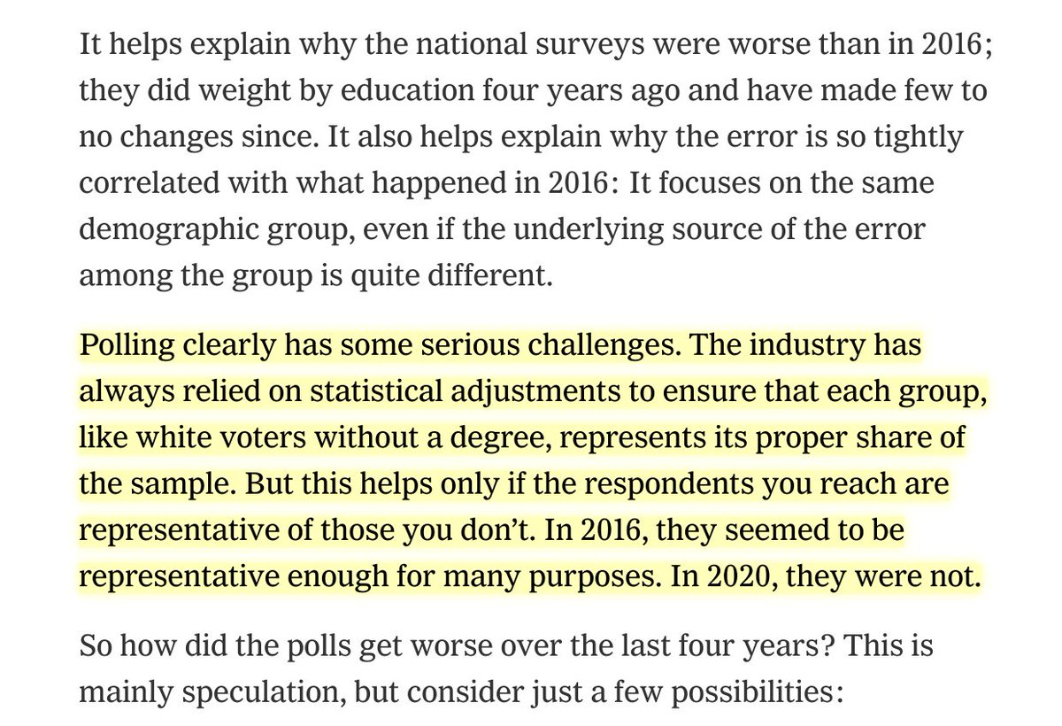 I'm just going to put an excerpt here from my NYT piece on why polls and forecasts were even less trustworthy in 2020 I published *before* the election. I'm not making post-hoc claims here. (Current text updated a bit now to reflect that's what happened) https://www.nytimes.com/2020/11/01/opinion/election-forecasts-modeling-flaws.html …pic.twitter.com/txR41T6G7I