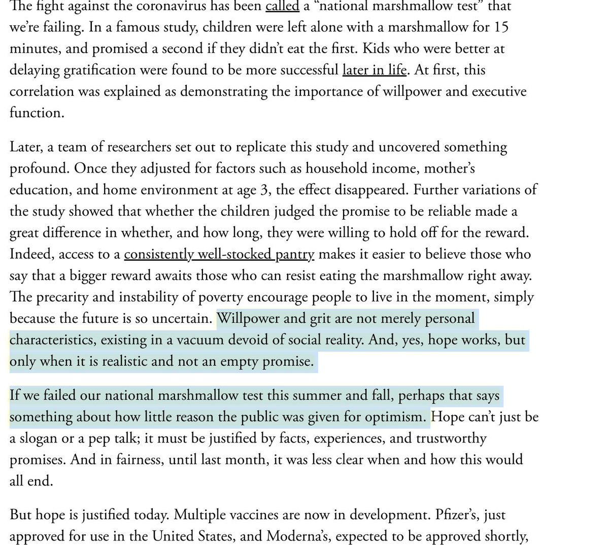 Btw I wrote this in my piece today. People misunderstand the whole marshmallow experiment/delay thing. Willpower is not divorced from hope and social conditions—and evidence. And we have evidence! These vaccines should call for celebration, not gloom. https://www.theatlantic.com/ideas/archive/2020/12/wait-until-march/617410/ …pic.twitter.com/54e7YhKzU4
