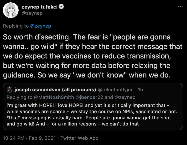 @zeynep look at alllllll these tweets of people saying they won't wear masks once they get the jab! i wonder if they'll wear them for the first month after, when their immunity is still low!https://twitter.com/NRafter/status/1359354728174530560 …