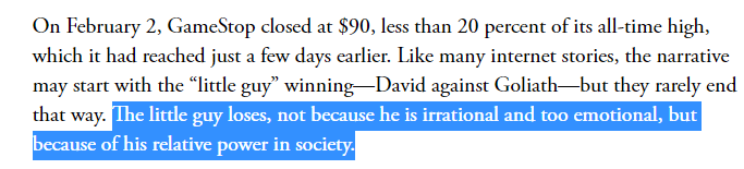I wrote about the Gamestop/Robinhood episode. Can we please, please, PLEASE stop separating the digital tools/internet from social and political dynamics in our analyses? Yes, tech platforms matter, yes, their business models matter, yes the rest matters. https://www.theatlantic.com/technology/archive/2021/02/gamestop-mess-shows-internet-rigged-too/618040/ …pic.twitter.com/3kjdStnBMB