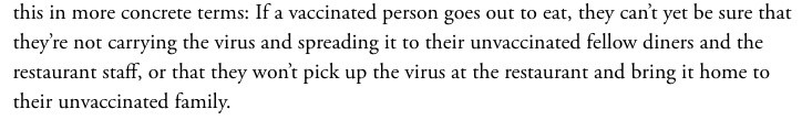 Also this from The Atlantic. I truly don't understand why the vaccinated person is called out as the risk factor in this scenario. Surely, between vaccinated diners & unvaccinated diners, the vaccinated ones are the lesser risk, no?pic.twitter.com/R5qr4APk01