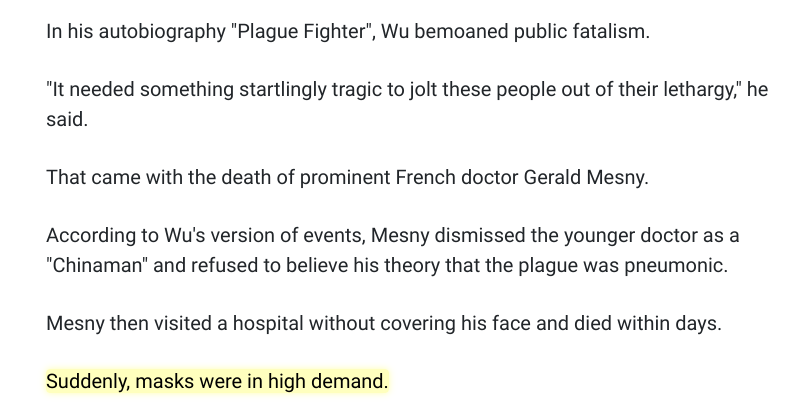 And then "suddenly masks were in high demand." That was 1910. Dr. Wu also established an effective quarantine and created safe-handling procedures for the deceased which essentially ended the terrible epidemic. He then modernized China's medical services. https://www.ncbi.nlm.nih.gov/pmc/articles/PMC4791421/ …pic.twitter.com/Dn0wTD7x5b