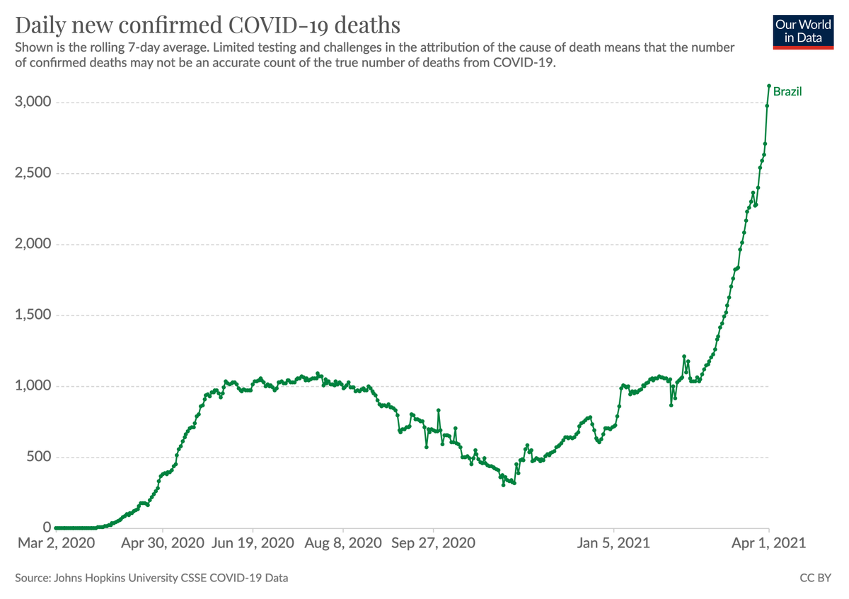 For Brazil, there’s a lot of focus on their variant which I believe has a weaker evidence base for its effects than the more systematically studied B.1.1.7. But unchecked exponential growth plus hospital system collapse will do just this, tragically, even without any variants.https://twitter.com/MaxCRoser/status/1378051326647631875 …