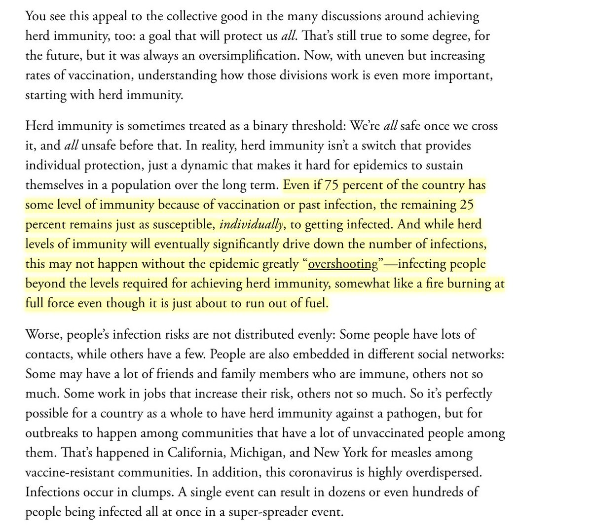 I tried to explain both the overshoot and how remaining large numbers of unvaccinated people can interact with local outbreaks in a recent piece. My experience is that many people think of herd immunity like a switch rather than a population-level dynamic. https://www.theatlantic.com/health/archive/2021/03/fourth-surge-variant-vaccine/618463/ …pic.twitter.com/878bClZquB
