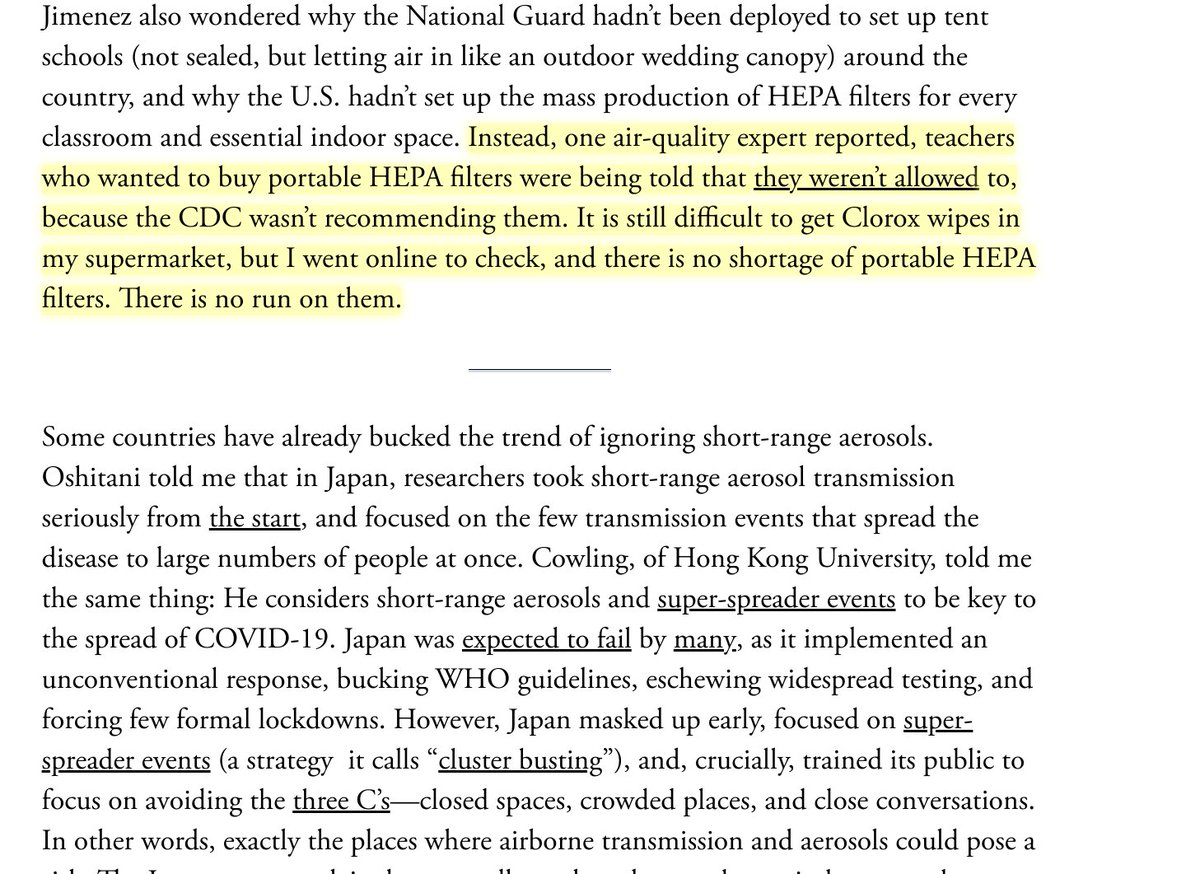 Absolutely. I wrote about this in my long piece on the science of it all back in July of 2020. Clorox wipes remained sold out for well into the pandemic, HEPA filters—which absolutely do help—did not. Some places wouldn't even *allow* schools to use them. https://www.theatlantic.com/health/archive/2020/07/why-arent-we-talking-more-about-airborne-transmission/614737/ …pic.twitter.com/CrUInUrLxA