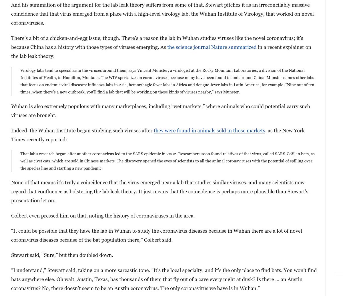 No, Colbert got it wrong, but I'm now encountering articles trying to make the case Colbert was right on that. Like here, in the Washington Post quoting a Nature article quoting someone. https://www.washingtonpost.com/politics/2021/06/15/jon-stewart-lab-leak-colbert/ … https://twitter.com/APunkRockFuture/status/1404862852880650241 …pic.twitter.com/Z1wvmXBBcy