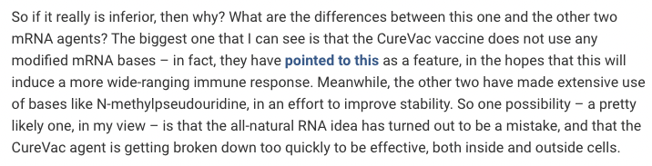 Any thoughts as to why the CureVac mRNA vaccine is not as effective as the two others?https://www.curevac.com/en/2021/06/16/curevac-provides-update-on-phase-2b-3-trial-of-first-generation-covid-19-vaccine-candidate-cvncov/?utm_source=Nature+Briefing&utm_campaign=d62593c184-briefing-dy-20210617&utm_medium=email&utm_term=0_c9dfd39373-d62593c184-44669897 …