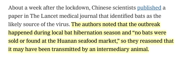 Chinese scientists, Lancet, Jan 2020: "bat virus but local bats hibernating." Dr. Shi, Nature, Feb 2020: guilty bats in Yunnan, ~1000km away. Repeats later she thinks zoonosis but not in Hubei—let alone Wuhan. Western media 16 months later: The lab was where the viruses were!