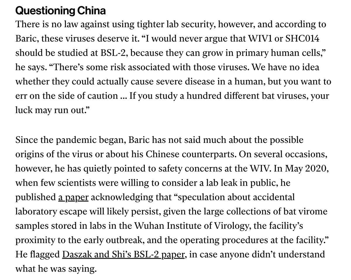 I do not dismiss. I just note that every clause in that quote is a hypothetical, which is true for the entire lab-escape argument. I've yet to see a real weighing of lab-escape v. zoonosis in any major lab escape piece of journalism, and I'm deeply troubled by that.