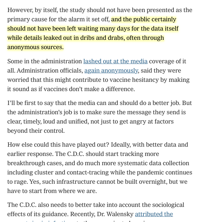On media coverage, especially on the Delta vaccinated/unvaccinated transmission that administration officials were upset with: Honestly, I agree with them that some coverage was pretty misleading—but it's *their* job to leave less space for that by being super clear and forceful.