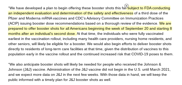 Here's that statement from the HHS. It says booster "subject to FDA conducting an independent evaluation and determination of the safety and effectiveness of a third dose". Why the press release *now*, then? How is this not pressure on the FDA? Come on. https://www.hhs.gov/about/news/2021/08/18/joint-statement-hhs-public-health-and-medical-experts-covid-19-booster-shots.html …pic.twitter.com/lkzX9JrD2L