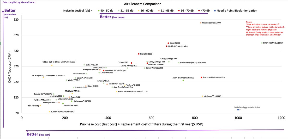 I'm getting questions, so let me highlight this useful chart for selecting a HEPA air cleaner. Also remember: if you can, opening windows is really good. Avoid gimmicks and ionizers. HEPA + CADR (speed at which it cleans the air) is all that you should be looking for.https://twitter.com/marwa_zaatari/status/1433469347973017604 …