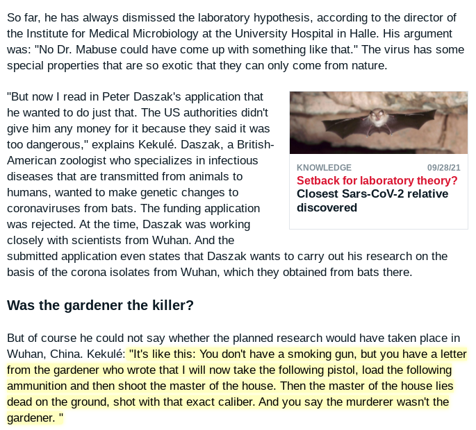 How German virologist Alexander Kekulé describes his reaction to the unearthing of the (unfunded!) grant application by EcoHealth/WIV. (Also note he later points out why/how the way forward is the same: better outbreak surveillance and lab oversight). https://www.n-tv.de/panorama/Kekule-sieht-neue-Hinweise-fuer-Laborunfall-article22875216.html …pic.twitter.com/1NOpLSAYS9