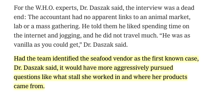 Plus, we now learn from Peter Daszak that the WHO team that signed off on a report claiming frozen food was more likely origins than any lab connection says they NEVER ASKED THE FIRST KNOWN SEAFOOD MARKET CASE WHERE SHE WORKED OR WHERE HER PRODUCTS CAME FROM. Kinda out of words.pic.twitter.com/1vn77TSJ6o