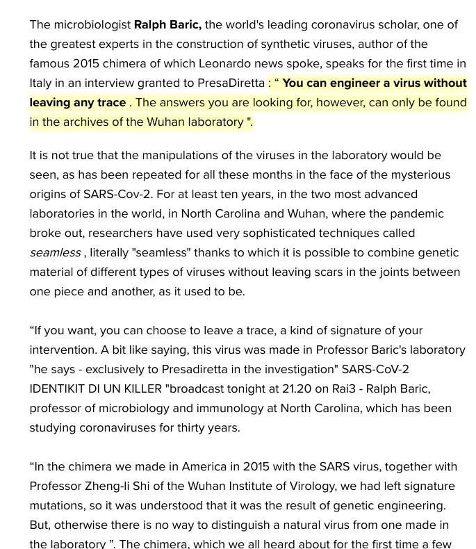Two examples below. Ralph Baric, leading coronavirologist and David Baltimore, Nobel Laureate. They clearly say that you cannot resolve genetic engineering by looking at the genome alone—need to know what the lab actually did, i.e. forensic investigation. That's the uncertainty.pic.twitter.com/y3x8Uryiyx
