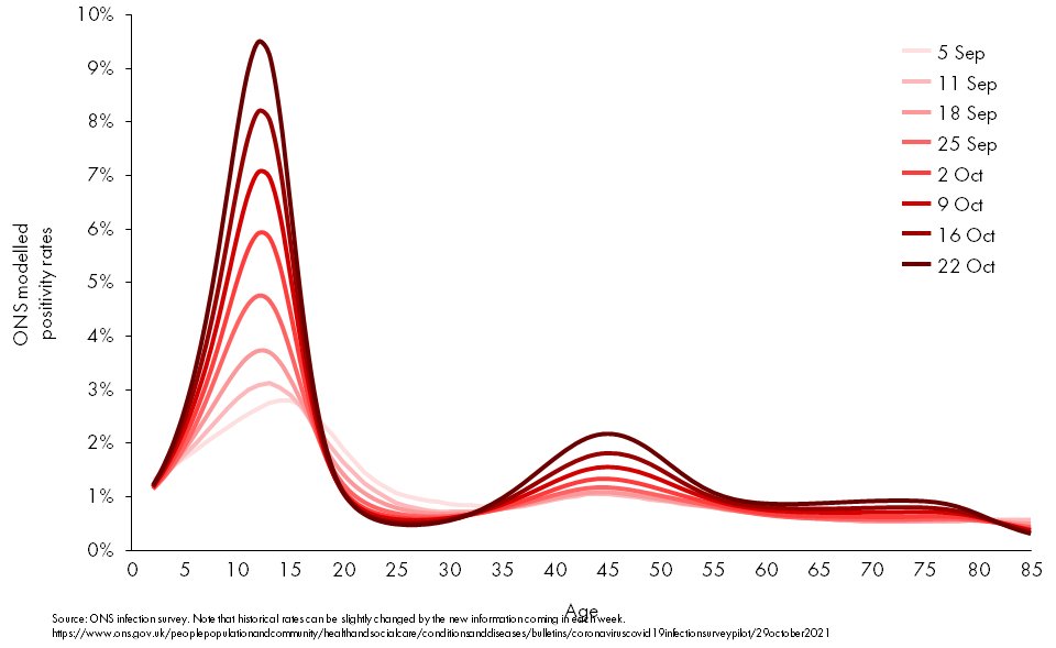 Updated! I'd guess the middle bump is the parents of the (much less vaccinated) children on the left getting a more breakthroughs, especially as they are also too young to have yet gotten boosters like the older folks on the right. ht @andrew_croxford.https://twitter.com/PaulMainwood/status/1454072198528962561 …