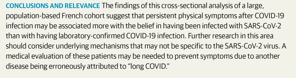 A new study casts doubt that Covid-19 itself drives many long Covid symptoms. A personal belief of having had Covid was tied to multiple ongoing symptoms, eg: fatigue, breathlessness, impaired attention. Actual Covid history was only tied to one: insomnia. https://jamanetwork.com/journals/jamainternalmedicine/fullarticle/2785832 …pic.twitter.com/I7qYy4BT34