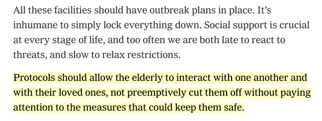 I'll repeat again. As I've long argued, our nursing home and hospital policies of isolation and no-visits are cruel, inhumane and indefensible. They should be replaced by sensible, pro-active protective measures, with isolation as a last and *temporary* resort if all else fails.pic.twitter.com/njksFMflfx