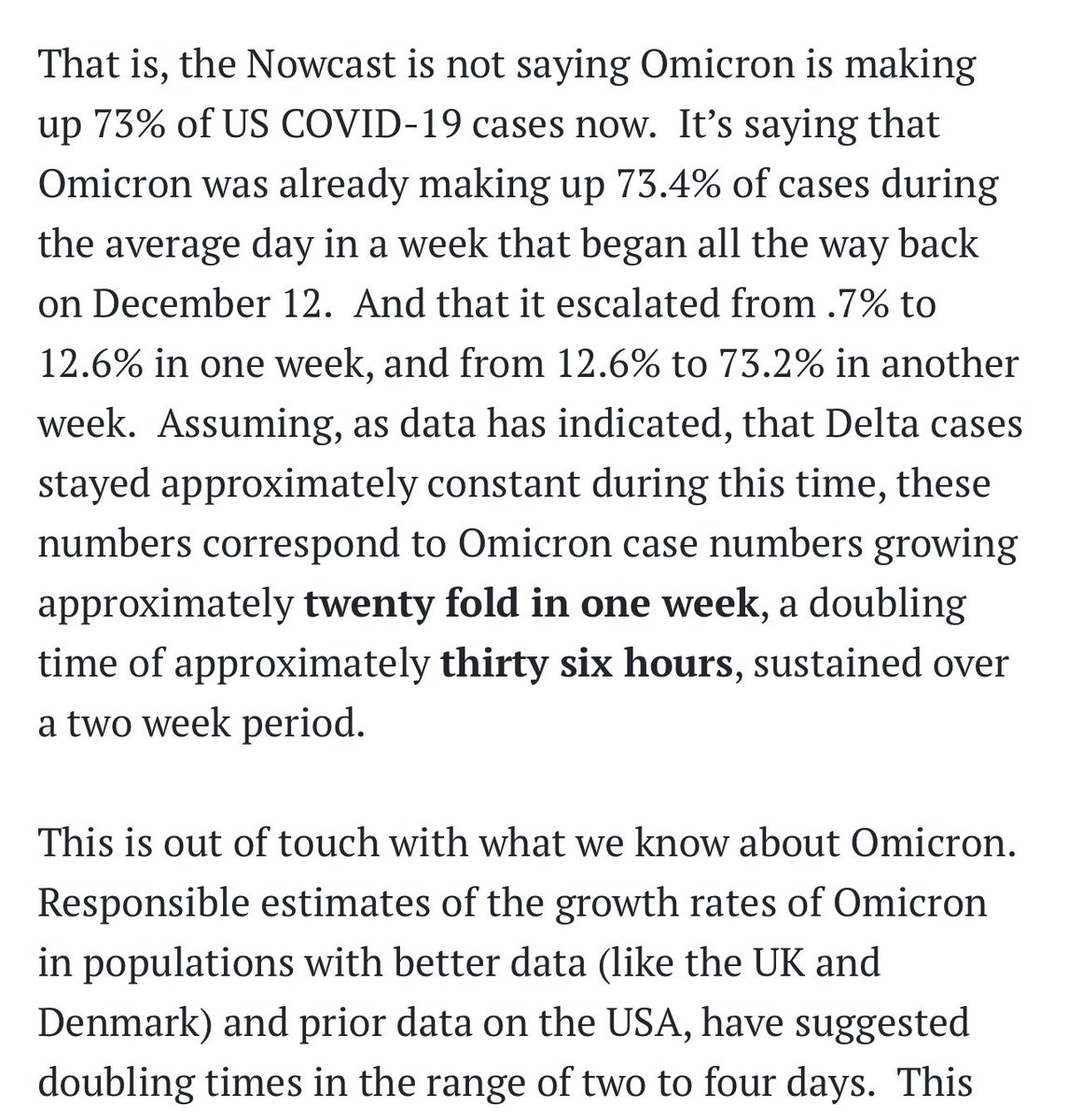 That big crazy stat from the CDC— 73% of cases are already Omicron! — that’s all over the headlines tonight? It’s almost certainly wrong. It doesn’t pass the smell test. What’s far more likely is the CDC’s Nowcast model has a bug.https://theprepared.com/blog/73-of-covid-cases-arent-omicron-yet/ …