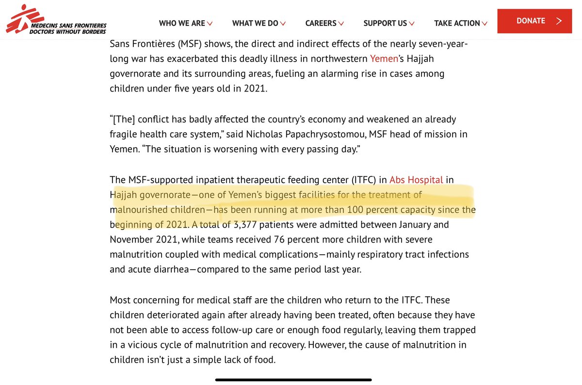 I wish we didn't have to fundraise for basic stuff but.. UN says it has to cut food aid to Yemen—lack of funds. Things are so bad that MSF has a feeding hospital—to treat severely malnourished kids.😢 It's operating at 100% capacity. Still not enough.https://twitter.com/zeynep/status/1476581221098475531 …
