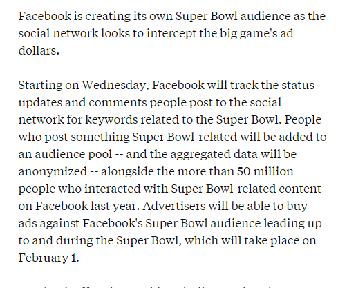 Facebook will identify its Super Bowl audience in real time & deliver it to advertisers. http://adage.com/article/special-report-super-bowl/facebook-lets-brands-target-people-discussing-super-bowl/296678/ …pic.twitter.com/skkL5zqZ2r